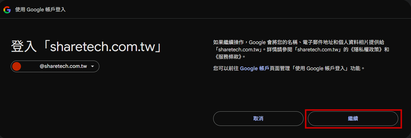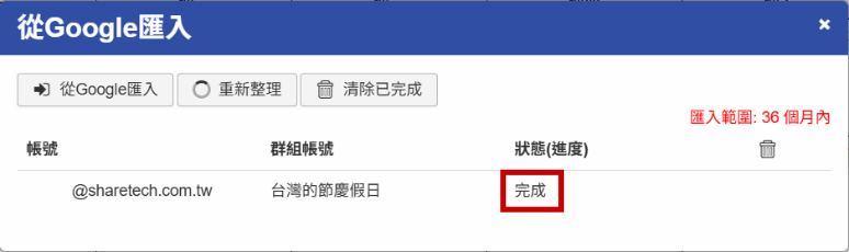 選擇要匯入Google日曆的帳號。 底下測試畫面瀏覽器為Chrome版本:136.0.7103.114 (正式版本) (64 位元)