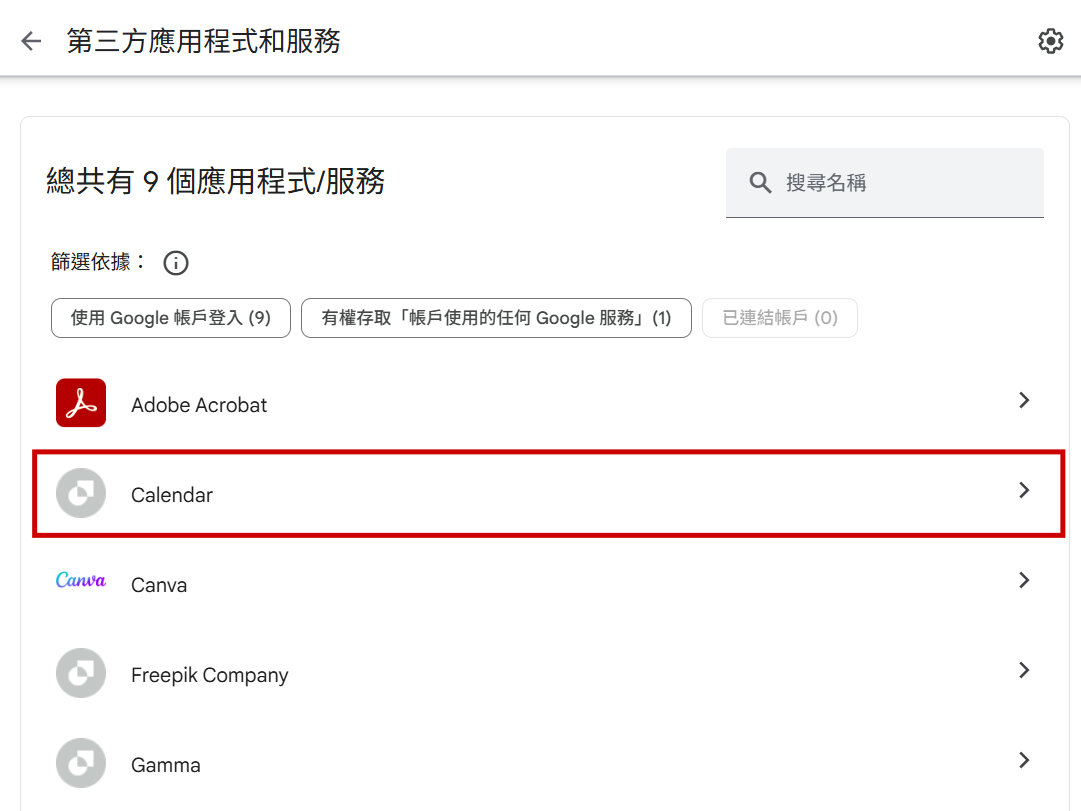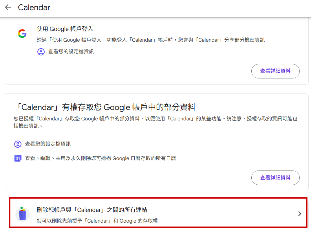 到你的Google 管理你的Google帳戶>安全性>Calendar>刪除您帳戶與「Calendar」之間的所有連結。