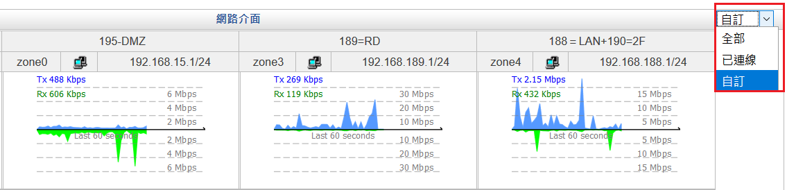 藍色代表 Zone Out (TX) 流量 , 綠色代表 Zone In (RX) 流量 。