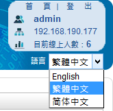登入後,可以在管理介面的右上角連到首頁、登出或切換管理介面的語言;此處也會顯示管理者登入的 IP 位址及目前有多少管理者登入。