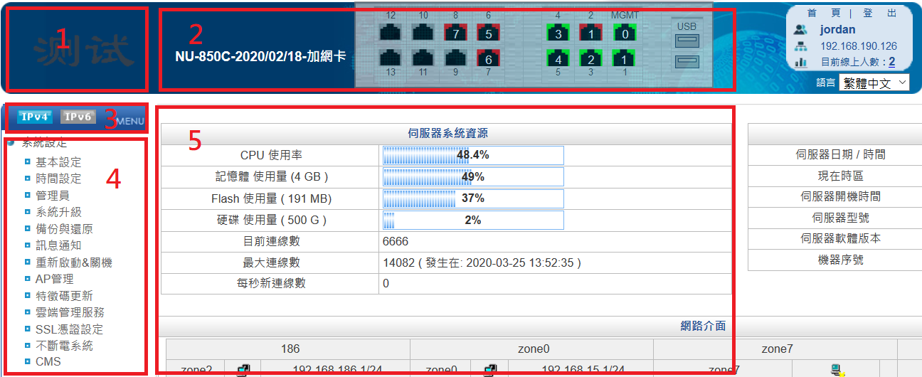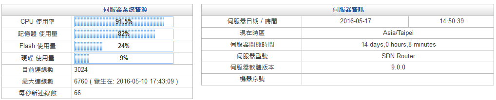 顯示目前設備的時間及時區,甚至是開機時間;同時也顯示設備目前的 CPU、RAM、Flash、HDD 等重要資源使用量,管理者能夠藉此判斷設備是否超過負載。