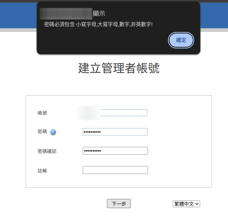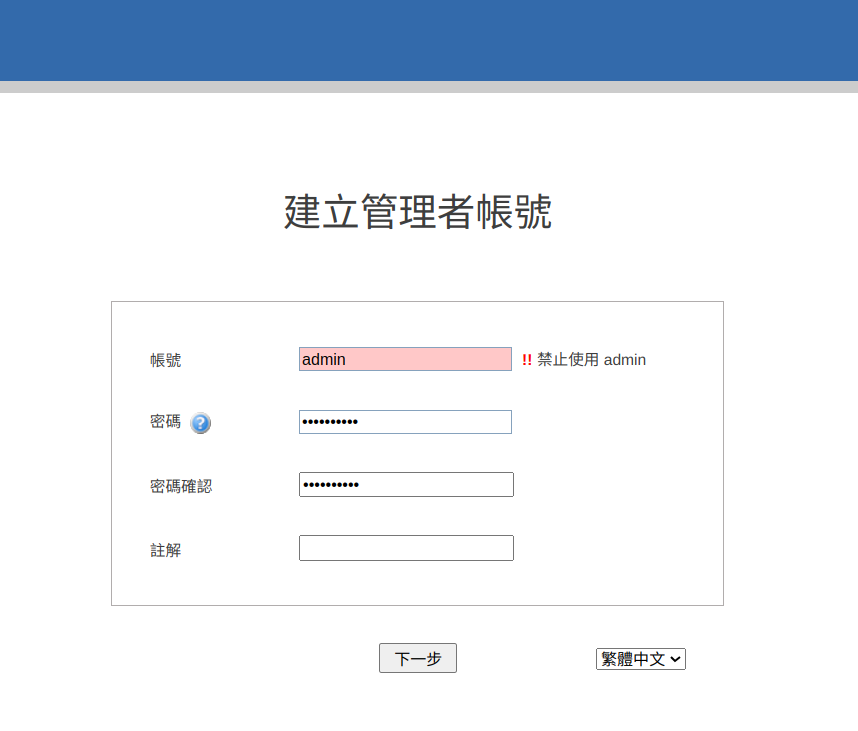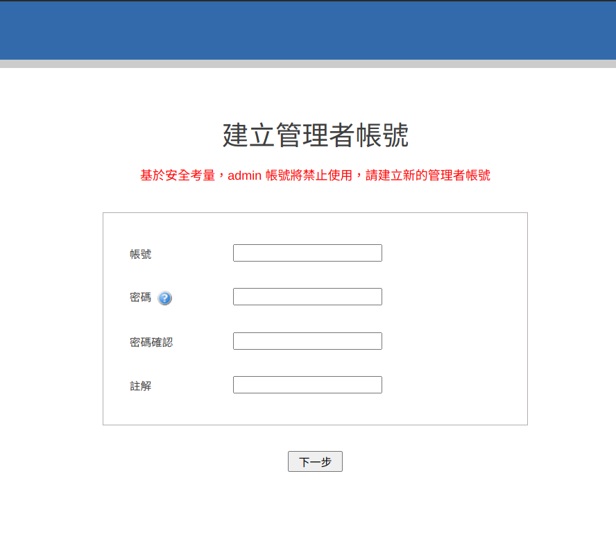 若取得設備的韌體版本為9.0.3,或是有恢復初廠預設值時,首次登入系統會直接要求新增帳號及密碼,並且禁止新增admin帳號使用。