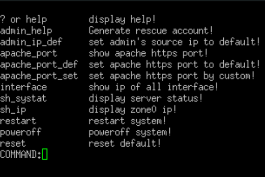 【ClearAdminIP】: 清除管理介面IP限制。參考 2-3-3、管理者的 IP 位址