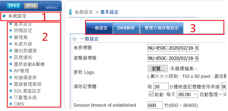 1.【Logo 區】: 透過變更這裡的圖示,除了讓設備方便辨識外,更可以凸顯企業的整體形象,圖片的格式為 150 * 90 pixel 。