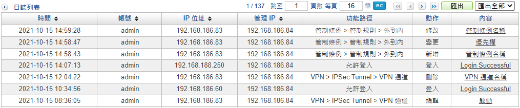 【管理 IP】:此帳號由哪個防火牆的 IP 位址登入介面。