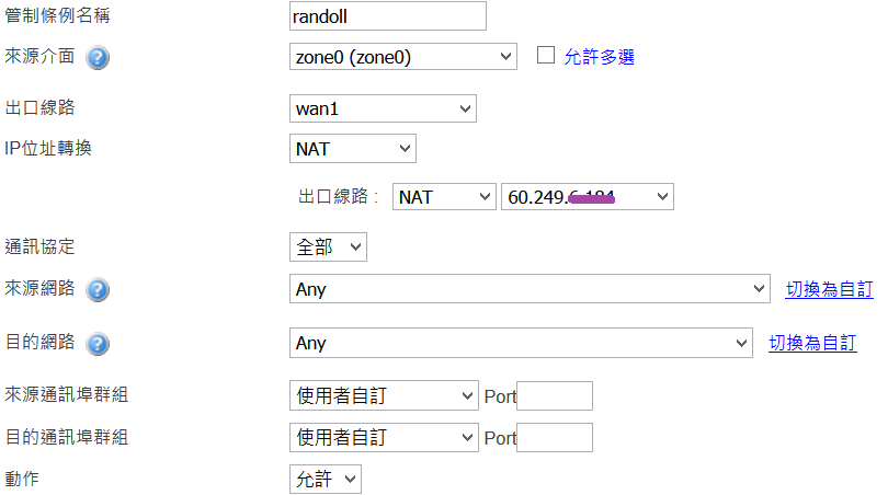 【來源 IP/Port】:通過管制規則的來源 IP 位址跟 Port。