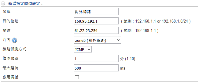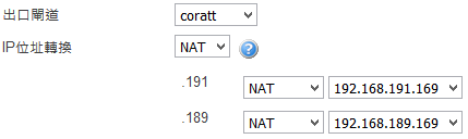 【出口線路 / IP 位址轉換】:參考下一個段落 Outgoing 基本設定 > 出口線路跟 IP 位址轉換 說明。
