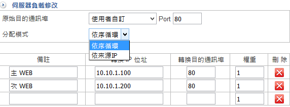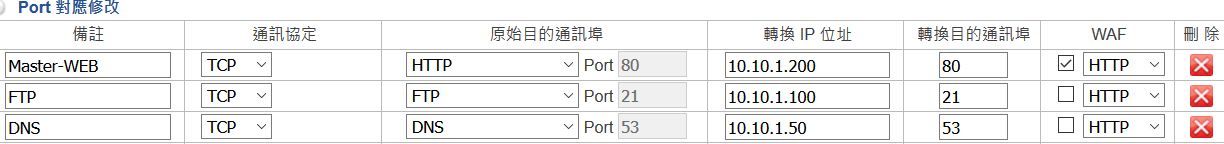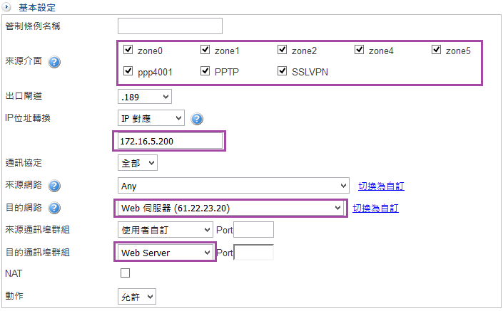 IP 對應:有 3 種模式,這裡使用 IP 對應,也就是 1 對 1 NAT,真正對外服務的 Web 伺服器 IP 位址是 172.16.5.200。