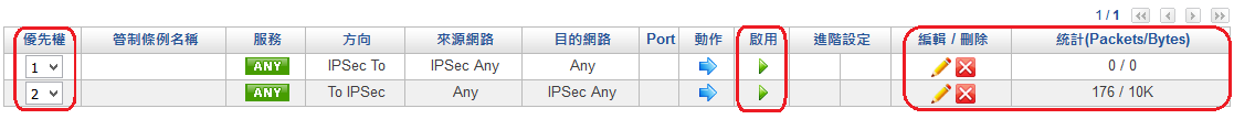 【優先權】:NG-UTM 會從第一條 IPSec 管制規則開始執行,所以比對順序對於網路封包的通過與否有關鍵性的影響,數字越小表示越優先。