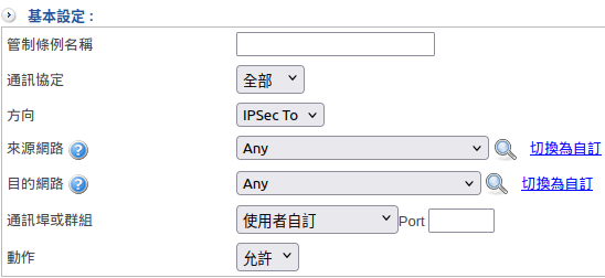 對於 IPSec VPN 通道來說,應用在 Site-to-Site VPN 場景,所以管制規則相對來說簡單一些,只包含「基本設定」、「進階設定」。
