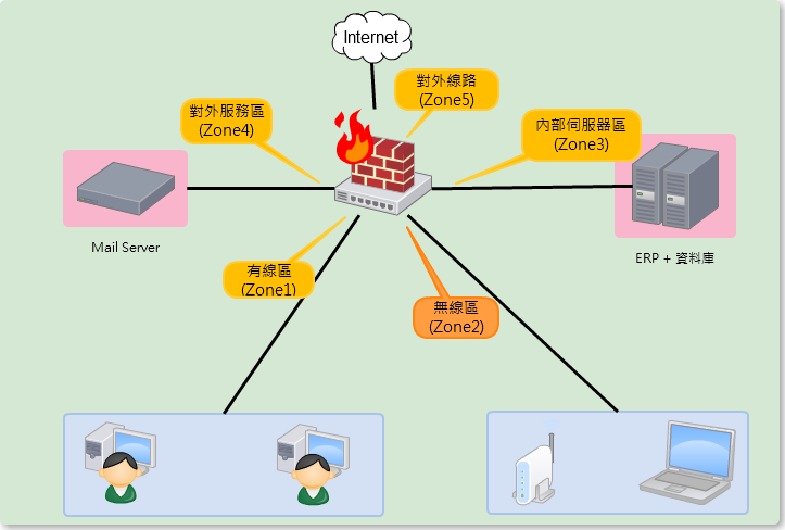內部伺服器區 (Zone3) 禁止上網際網路,同時只有內部特定 IP 位址能進入。