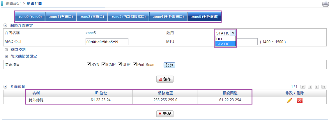 同時也建立會在 Zone 5 提供對外服務的 2 筆 IP位址。