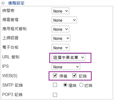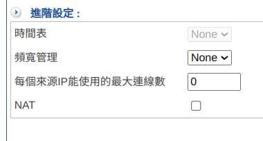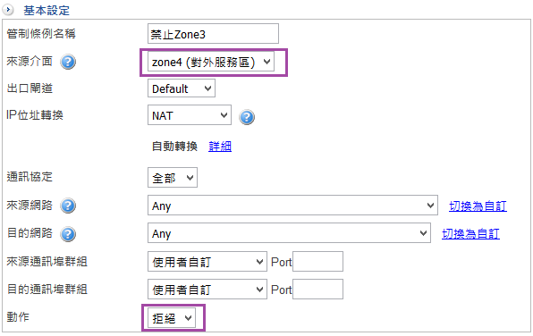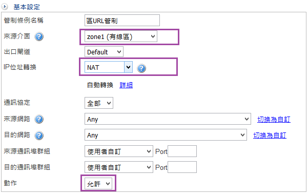 每條管制規則由 3 個部分組合而成,分別是基本設定、進階設定跟防護設定,除了基本設定區的資料必填,另外 2 個區域的設定由管理者自行決定配置。