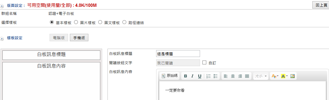 在「管理目標 > 電子白板」中選擇已建立的電子白板進行版面設計。
