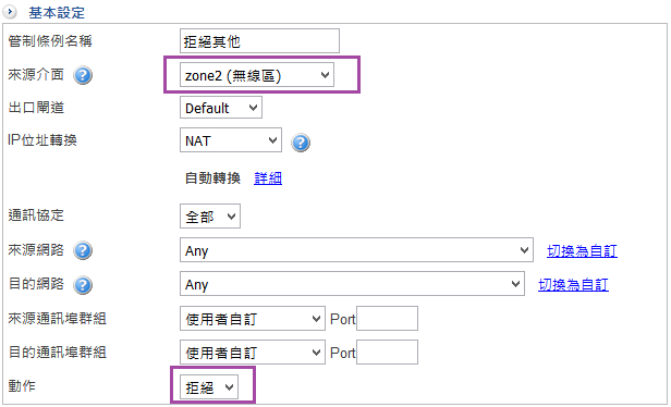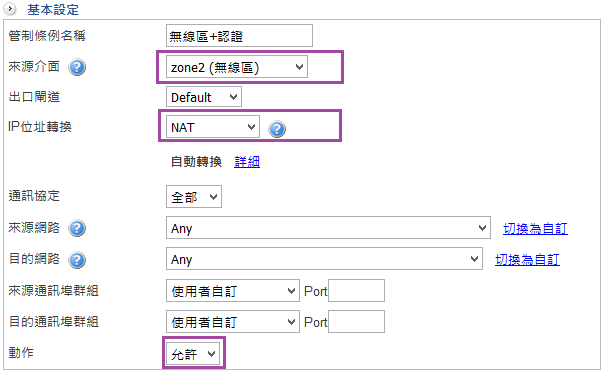 新增一條管制規則,【來源介面】為 Zone 2 無線區、【動作】為允許,指定閘道為對外線路;因為是虛擬 IP 區段,要上網際網路時需要做 NAT,所以選擇來源位址轉換。