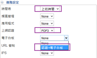 在「管理目標 > 上網認證 > 認證設定」,確認認證的機制。例如:同一個帳號可不可以同時登入、是否允許使用者改密碼。此項功能限定本機帳號。