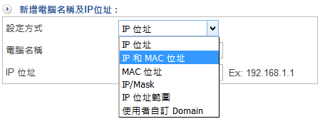 · 自訂 IP 位址模式 :管理者直接填入來源的 IP 位址或是 MAC 位址。