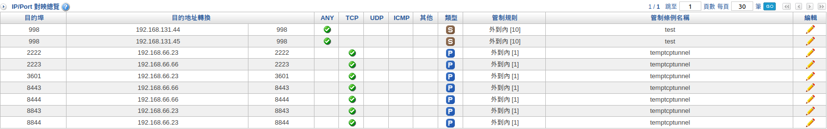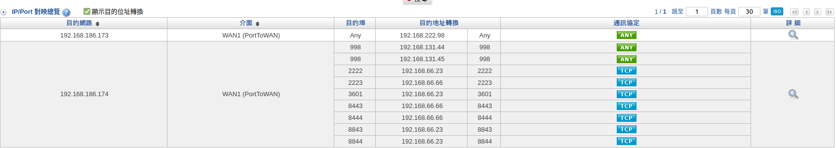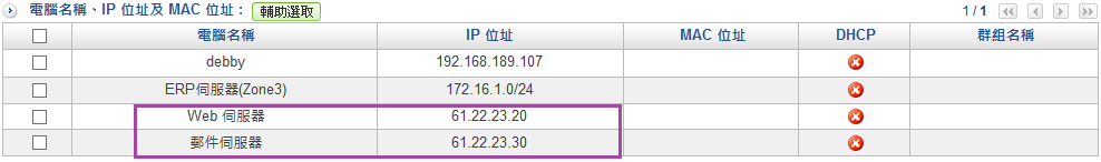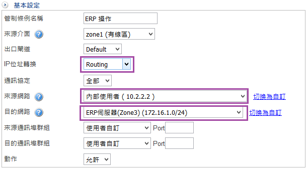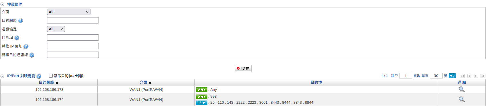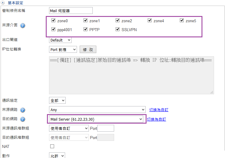 【目的 IP/Port】:通過管制規則的目的 IP 位址跟 Port。
