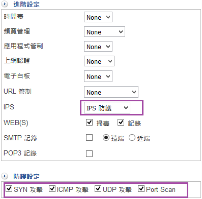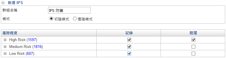 在「IPS > IPS 設定」中建立一條 IPS 的規則,阻擋高風險,其他的風險等級只要記錄就可以。