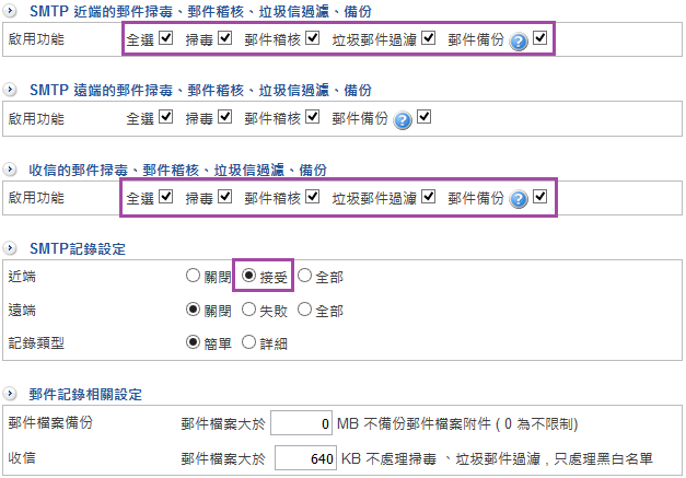 在「郵件管理 > 郵件過濾與記錄 > 郵件過濾與記錄」,設定要啟用的功能,並注意其他相關的配置。