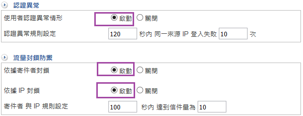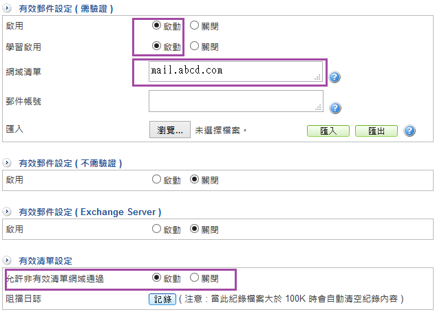 在【有效清單設定】中,為避免非設定網域的郵件進入,系統預設為關閉;若要允許其他網域通過,此處須改為啟動。