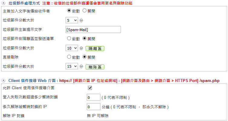 在「郵件管理 > 郵件過濾與記錄 > 基本設定」,設定垃圾郵件的處理方式及是否要讓使用者可以自行登入垃圾郵件區,取回被誤判的垃圾郵件。