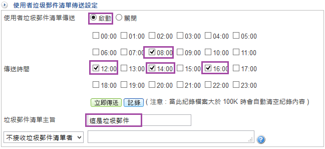 啟用垃圾郵件清單傳送機制並定下傳送時間。