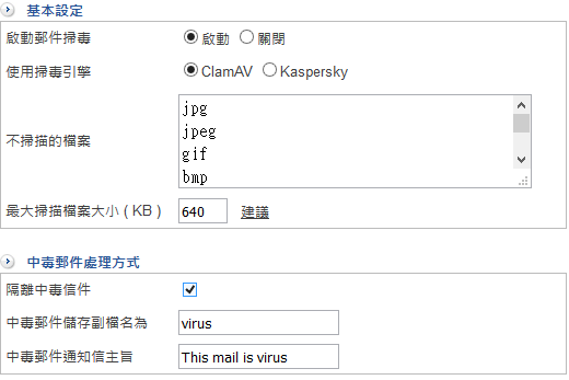 在「郵件管理 > 郵件掃毒 > 郵件掃毒」設定掃毒引擎、跟中毒後處理方式。