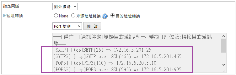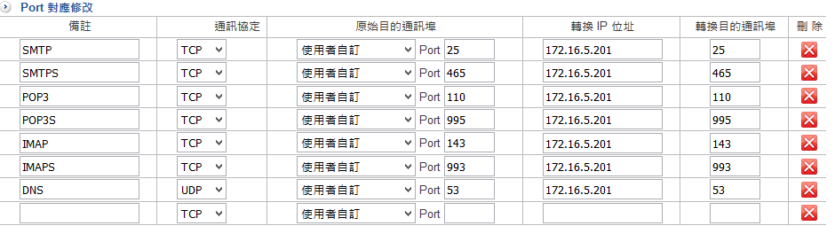 例如,61.22.23.30 的 SMTP 轉入 172.16.5.201 的 SMTP,61.22.23.30 的 POP3 轉入 172.16.5.202 的 POP3。