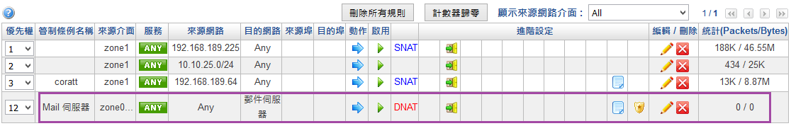 對外服務區 (Zone4) 只有 Mail 服務才能進出,並啟用垃圾跟病毒郵件過濾。