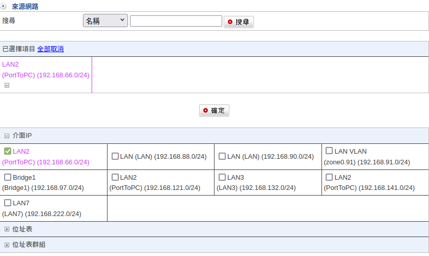A、在「網路設定 > 網路介面」中定義的內部 ZONE。 B、在「管理目標 > 位址表」中建立的位址表或是群組。 C、在各類 VPN 中分配的 IP 位址,包含 PPTP 伺服器、SSL VPN 及 L2TP 等分配給遠端用戶的 IP 位址。