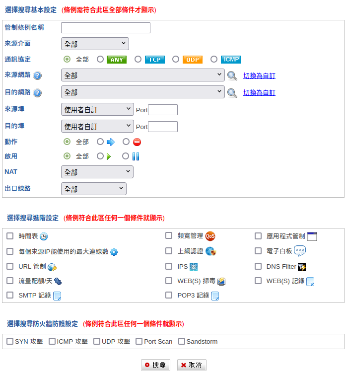 【搜尋條例】:在此頁面搜尋出想要查看的條例。可依照來源介面搜尋或自訂搜尋條件,如:找出設定時間表的條例,或通訊協定為 UDP 的條例等。
